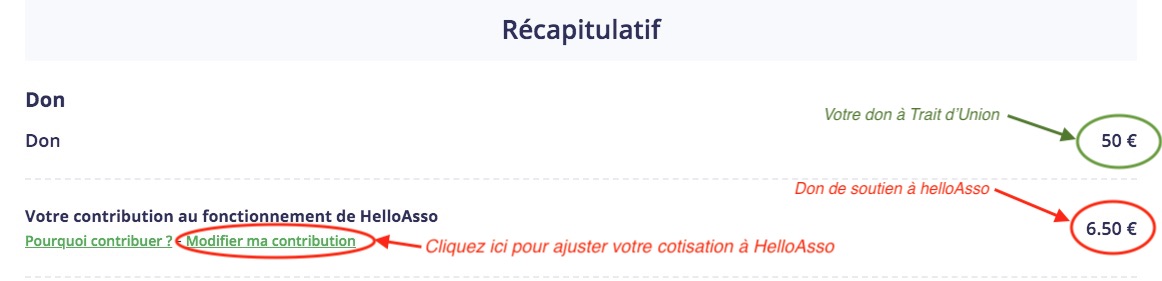 A l'étape paiement, un montant a été ajouté d'office par HelloAsso, organisme qui nous permet de collecter des fonds pour financer notre campagne. Le montant peut être ajusté voire remis à zéro si vous le souhaitez suivant le montant de la cotisation