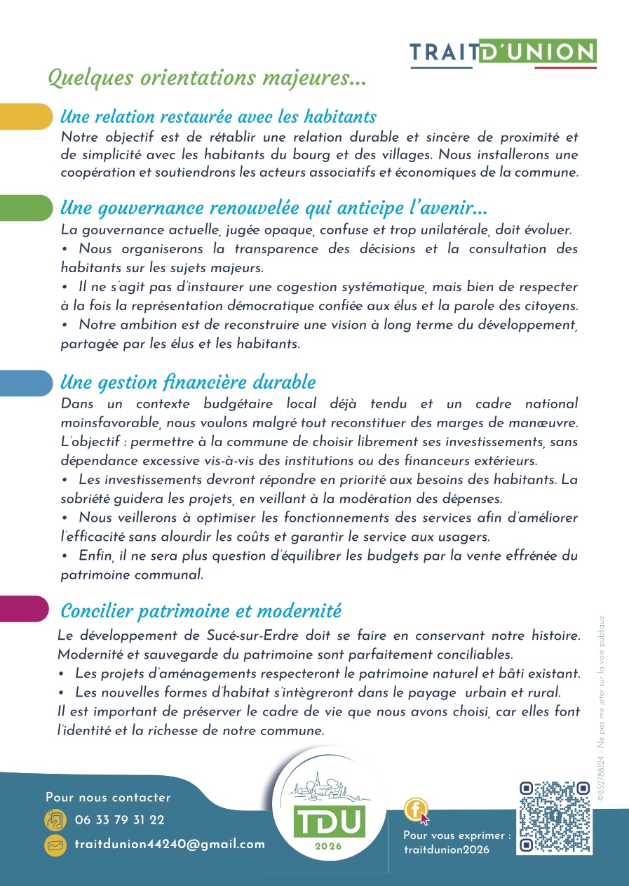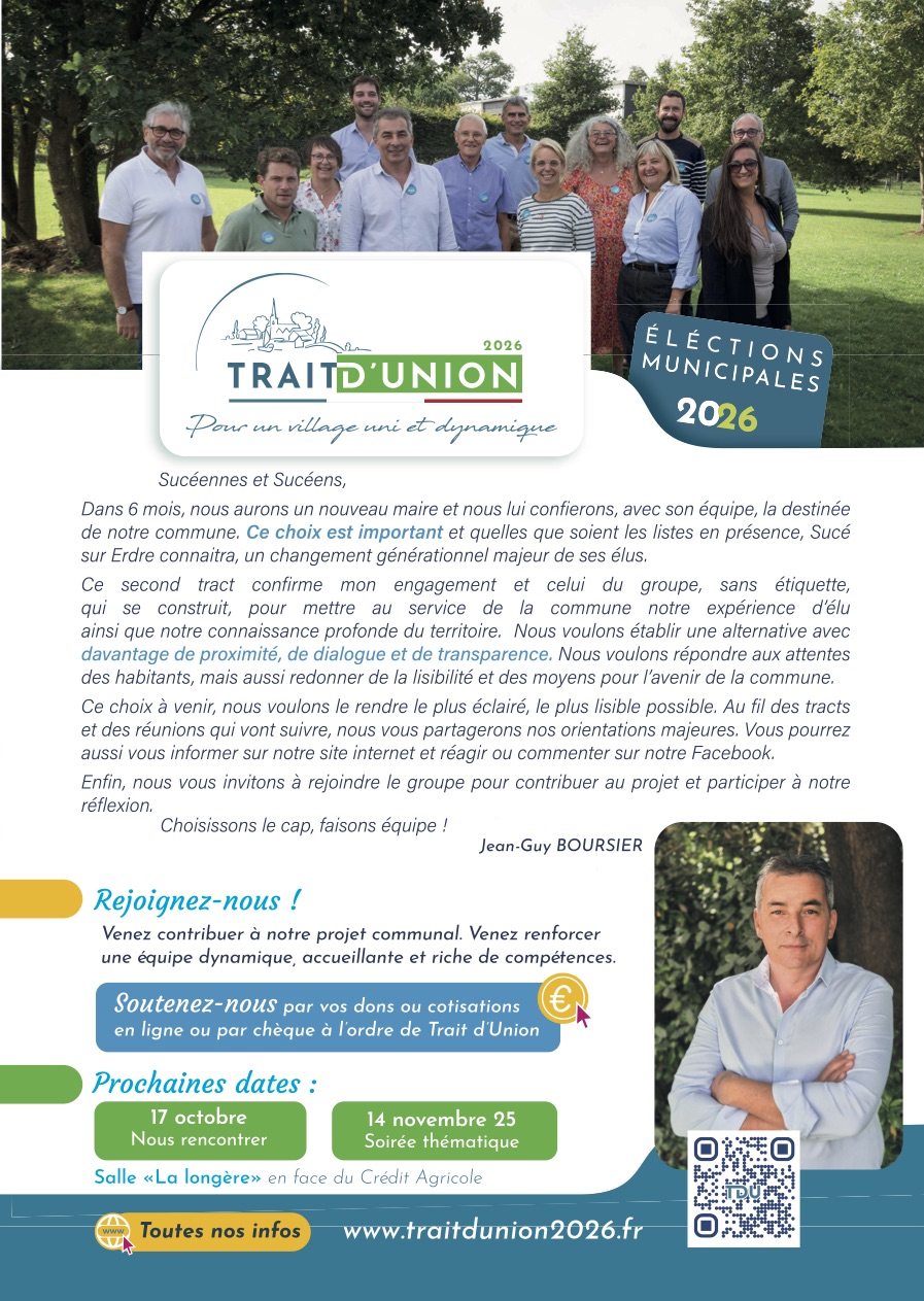 Notre site Trait d'Union - Elections Municipales - Sucé-sur Erdre 2026 utilise des cookies pour réaliser des statistiques de visites, partager des contenus sur les réseaux sociaux et améliorer votre expérience. En refusant les cookies, certains services seront amenés à ne pas fonctionner correctement. Nous conservons votre choix pendant 30 jours. Vous pouvez changer d'avis en cliquant sur le bouton 'Cookies' en bas à gauche de chaque page de notre site. En savoir plus